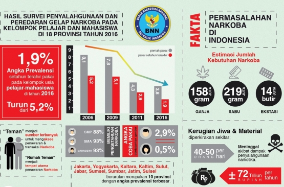 World Drugs Reports 2018 yang diterbitkan United Nations Office on Drugs and Crime (UNODC), menyebutkan sebanyak 275 juta penduduk di dunia atau 5,6 % dari penduduk dunia (usia 15-64 tahun) pernah mengonsumsi narkoba. Sementara di Indonesia, BNN data dari 2017 menunjukkan sebanyak 3.376.115 orang pada rentang usia 10-59 tahun telah melakukan penyalahgu aan narkoba.